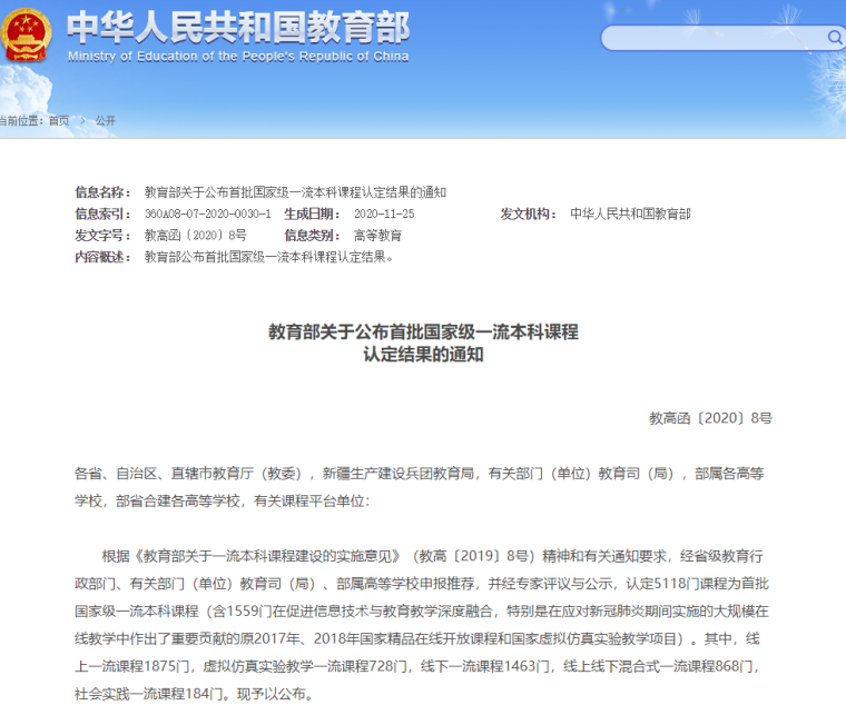 近日,教育部正式公布首批国家级一流本科课程认定结果。