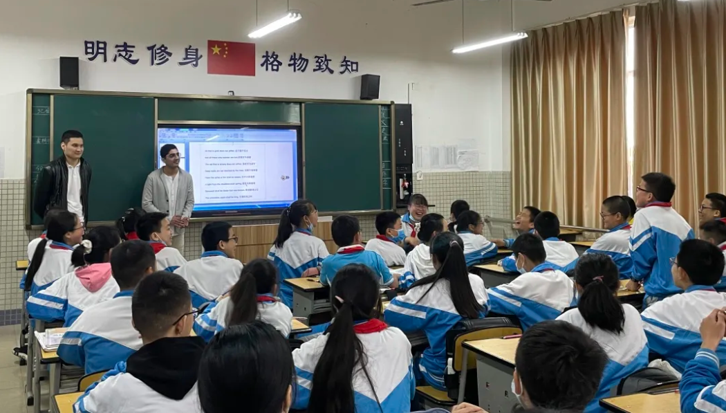 我们巴基斯坦学生和哈萨克斯坦学生作为留学生代表参加了开幕式。随后,留学生们走入了金马学校中小学同学的课堂,朗诵英文诗词,并与中国同学分享诗词之美,感受诗词之趣。活动中,留学生和中国同学们畅谈,向大家介绍了自己国家乡风土人情,掌声和笑声此起彼伏。现场同学们纷纷表示,留学生们非常亲切,在这样的分享课程中获益良多。