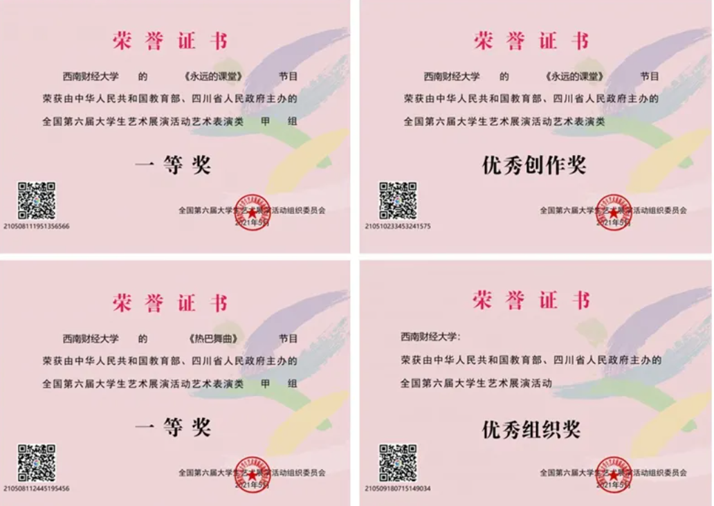 5月6日至12日,全国第六届大学生艺术展演活动在成都城市音乐厅盛大举行。我们艺术团交响乐团的乐器合奏《热巴舞曲》、舞蹈团舞蹈节目《永远的课堂》分别以所在组别四川省一等奖的优异成绩入围全国展演,其中舞蹈节目《永远的课堂》应邀参加开幕式演出。12日传来喜讯,2个展演节目双双获全国金奖,学校获优秀组织奖,《永远的课堂》获优秀创作奖共四项大奖,创学校有史以来最好成绩。本次大艺节再一次集中展示了学校聚焦美育工作、打造西财美育文化取得的良好育人成效和丰硕成果,传递了西财青年的文化自信和理想追求。