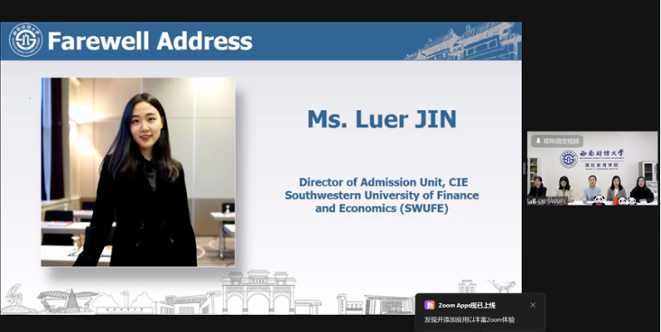 结营仪式上,402cc永利官网国际交流与合作处处长兼402永利集团官网入口院长梁婷以视频方式向支持此次线上课程的各友好院校、师生,向为此次汉语桥顺利开展付出辛勤劳动的各位老师、志愿者表达衷心地感谢,向积极参与并顺利完成学业的同学们表示祝贺,并诚挚邀请同学们有机会来财大学习深造。