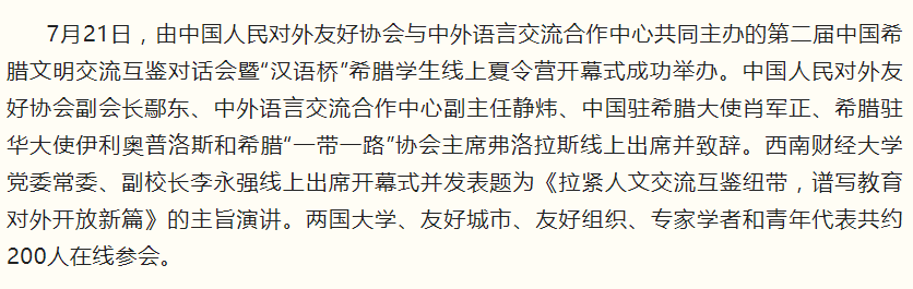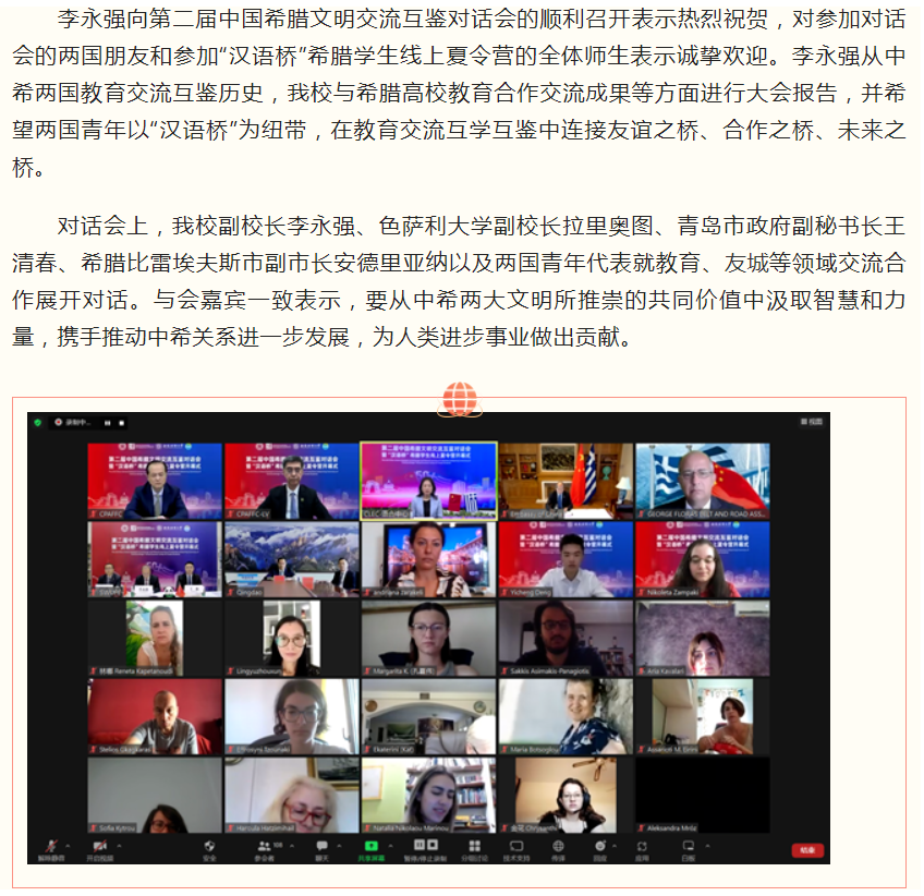 第二届中国希腊文明交流互鉴对话会暨402cc永利官网“汉语桥”线上夏令营开幕式成功举办