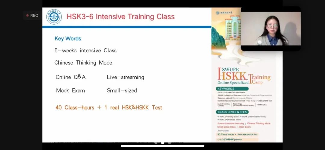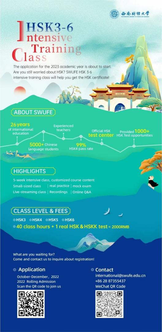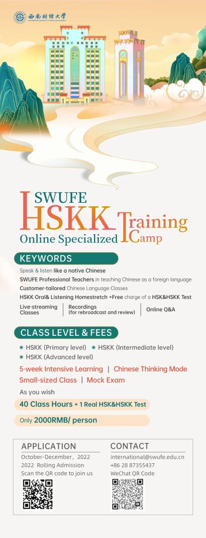 402永利集团官网入口致力打造“留学西财”精品语培项目,在2023年招生季开始前,根据学生学习需求,推出“HSK3-6冲刺班”和“HSKK线上专项训练营”两类汉语培训项目。该项目在行课时间、课堂内容和学习目标上安排灵活,集中展现“学生需求定制化”特色。