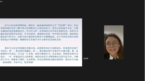 402cc永利官网优秀留学生代表Natalia Sverkunova也出席了此次开营仪式并分享了自己在西财的留学见闻。Natalia同学作为中国政府奖学金的俄罗斯留学生,十分热爱中国的历史文化和汉语的博大精深,她引用论语中的名言“三人行,必有我师焉”,向学员们介绍了自己学习汉语的方法和心得,希望大家把握这次难得的中文学习机会,了解更多中国的历史和文化。开营仪式上,学员们还观看了学校宣传片与往期“汉语桥”项目集锦视频,对即将开始的线上学习之旅充满期待。