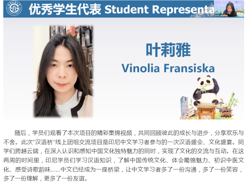 2022年12月23日下午,由教育部中外语言交流合作中心主办、402cc永利官网承办的2022年“汉语桥”线上团组交流项目——“中国—印尼跨文化交流人才专项团组”学习交流营顺利举行结营仪式。402永利集团官网入口项目成员与百余名来自印度尼西亚的学员和嘉宾齐聚云端,总结回顾两周以来线上学习的精彩瞬间与丰硕成果。