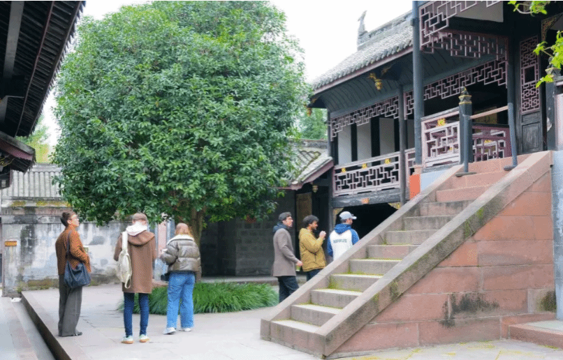 陈家大院始建于清乾隆年间,是一座集住宅、宗祠、园林于一体的综合性庭院式建筑群,门前竖立双斗桅杆,故俗称为“陈家桅杆”。留学生们在陈家大院内展开了一场沉浸式的历史探索。他们穿行于幽深的院落与古朴的厅堂之间,近距离观赏了精美的窗花木雕与寓意丰富的石刻纹饰,并深入了解了这座清代宅邸的建筑格局与功能划分。从议事正厅到居住厢房,从防风火墙到精巧的排水系统,每一处细节都成为解读中国传统建筑智慧与家族生活文化的生动课本。留学生们在这座真实的古建筑空间中,直观感受着巴蜀民居的独特魅力与厚重历史。