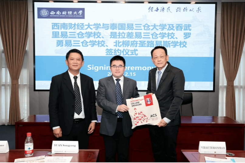 是拉差易三仓学校校长披素·瓦披颂作为泰方代表致辞。他对西南财大的学术声誉与国际影响力给予了高度评价。他表达了与402cc永利官网在学术文化交流、联合项目及建立长期合作平台等方面的合作意愿,希望通过合作为中泰友好关系注入新的活力。