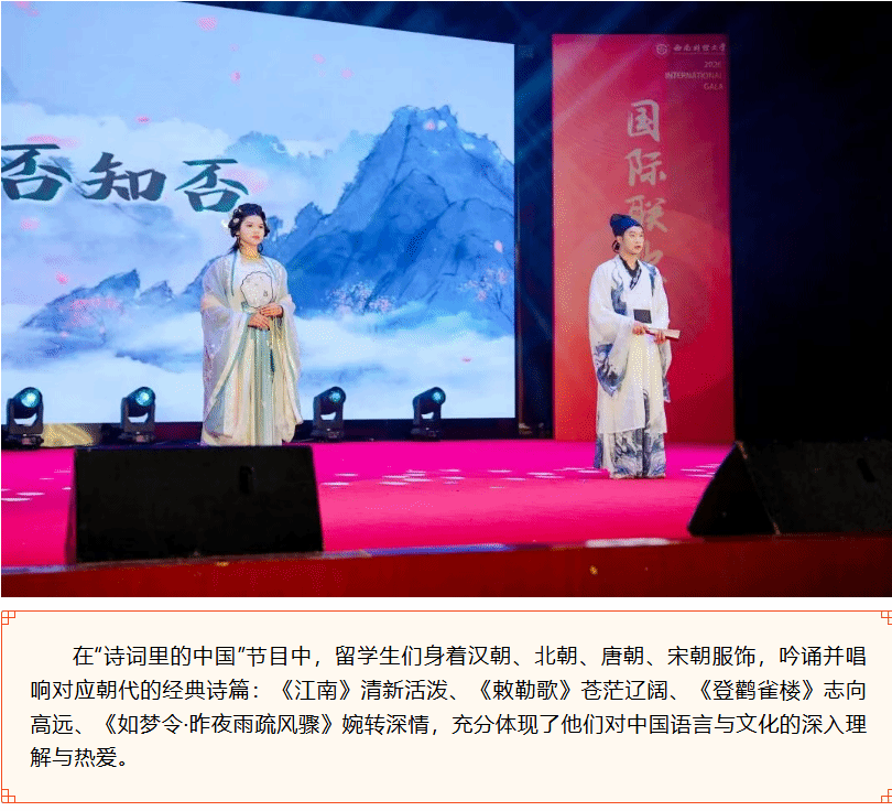 晚会结束后,师生们仍驻足交流、合影留念,温馨氛围持续洋溢。整场晚会充分展现了我们开放包容的国际化办学氛围,以及中外学子团结友爱、和谐共融的共同体精神。通过诗词、音乐、舞蹈等多元艺术形式,不同文化背景的学子在舞台上相互映照、彼此成就,活动有效促进了中外青年之间的理解与共情,培养了留学生知华、友华情感。